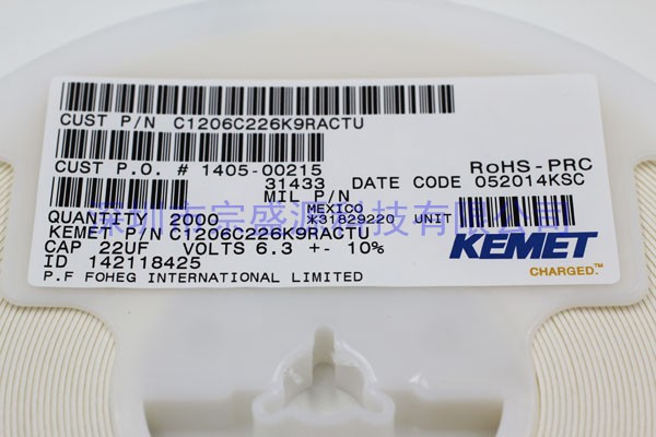 KEMET陶瓷電容 1206 6.3V 22UF C1206C226K9RACTU